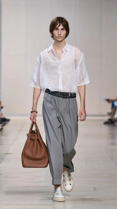 愛馬仕2024夏季男裝系列身體超脫束縛,自信駕馭短褲、夾克與短身風衣;陽傘條紋科技織物套頭衫與沙灘外套喚啟夏日冒險之旅。 沙黃色、蒸氣色、冰晶色、鼠尾綠,礦物色調糅合,彼此呼應,相互折射……輕柔,愜意,愛馬仕2024夏季男裝系列,透過服飾演繹建築美學,新穎剪裁、親暱紋理、微妙色彩、大膽 迭加、前衛廓形,彼此對撞交織。