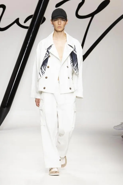 迪奧二零二四夏季男裝系列男裝世界再度煥新演繹伊芙•聖•洛朗(YVES SAINT LAURENT) 的套裝設計,其一九五九年系列的造型中的開衩、褶襉和領口設計等 細節巧妙融合輪廓寬鬆的夏日外套。 鞋履設計從一九九五年的LADY DIOR手袋中採擷靈感,為樂福鞋和涼鞋點綴全新圓形標識,厚底設計呈現典型新浪潮風格。 製帽大師STEPHEN JONES攜手高定織造手工藝匠人CECILE FEILCHENFELDT,共同推出新浪潮風格無簷便帽—“自由之帽”,並結合中國絨花傳統手工藝,將精緻的絲絨花卉設計成帽章等一系列單品。 融合傳統中國元素,中國符號體係正以不同方式亮相於國際時裝週舞台。