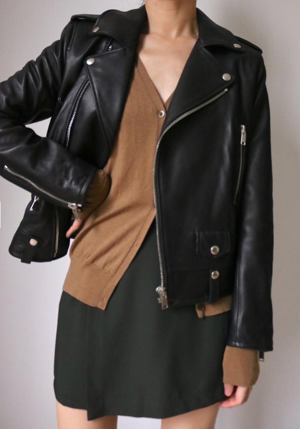 皮衣加短裙是時尚女孩的標準搭配,尤其是這又酷又美的感覺太吸引人了,想要更有個性一點的話,配上皮質短裙也是很不錯的選擇哦。 不過要記得,想要穿出率性的街頭感,下半身可以搭配球鞋或厚底短靴,千萬不要搭配高跟鞋了,有點個性衝突了。