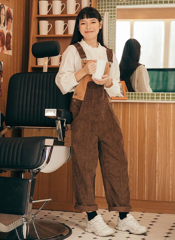 日系穿著可以說是把工裝風和小女孩風混搭得最好的一種風格了。 復古又帶點厚重感的燈芯絨背帶褲雖然看起來很男孩子氣,但是這時候搭一件圓領的白色木耳邊領長袖襯衫,瞬間俏皮可愛了起來,給人一種鄰家小女孩 的氣質。